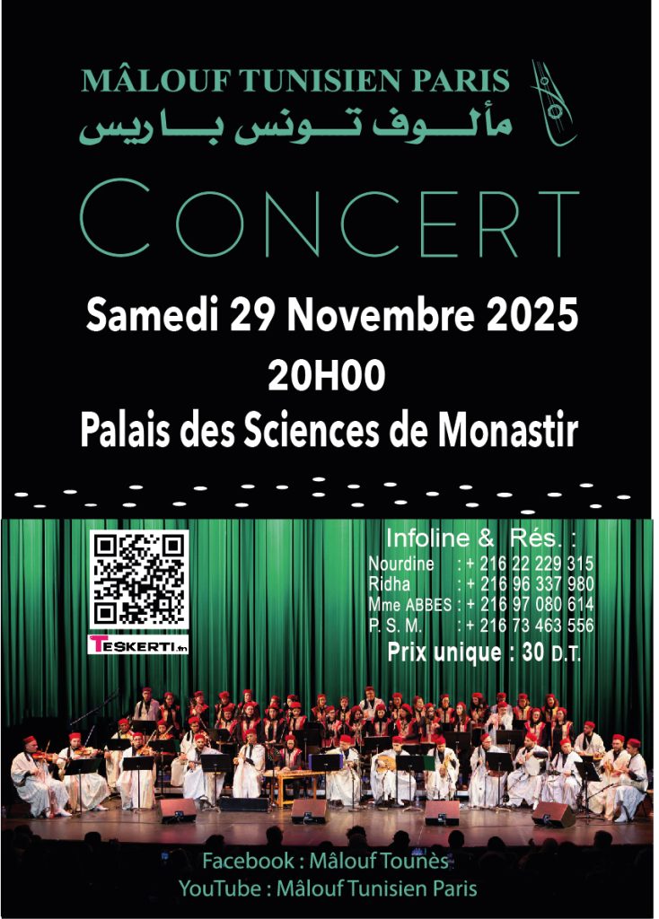 CONCERT DE MALOUF AU PALAIS DES SCIENCES MONASTIR et au Théatre SFAXVendredi 28 Novembre 2025 à SFAXet le Samedi 29 Novembre 2025 à Monastir